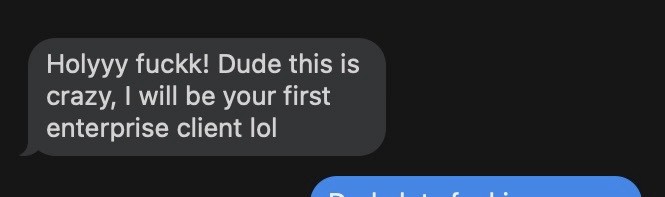 "Holyyy fu*kkk! Dude this is crazy. I will be your first enterprise client lol."